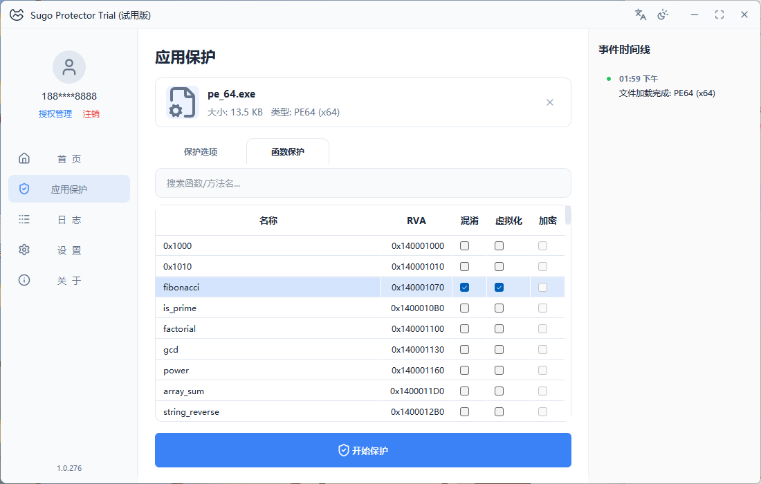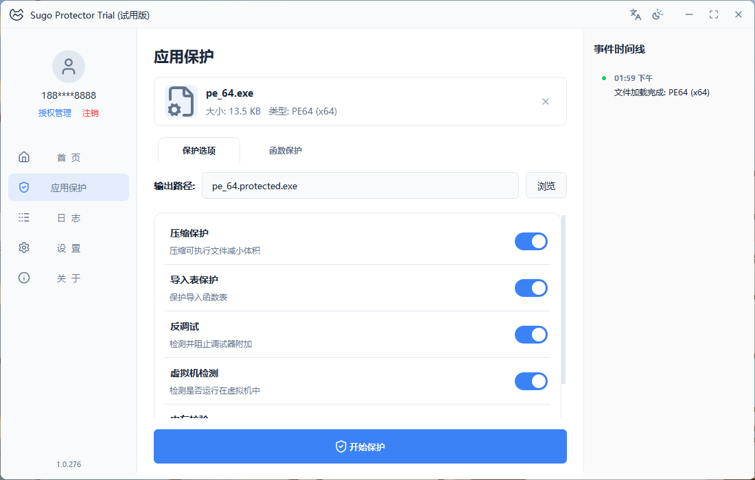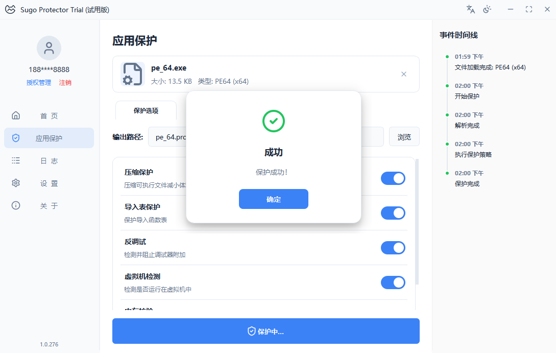 - 查看进度:右侧的“事件时间线”会实时显示处理进度(文件加载 -> 开始保护 -> 解析 -> 执行策略)。