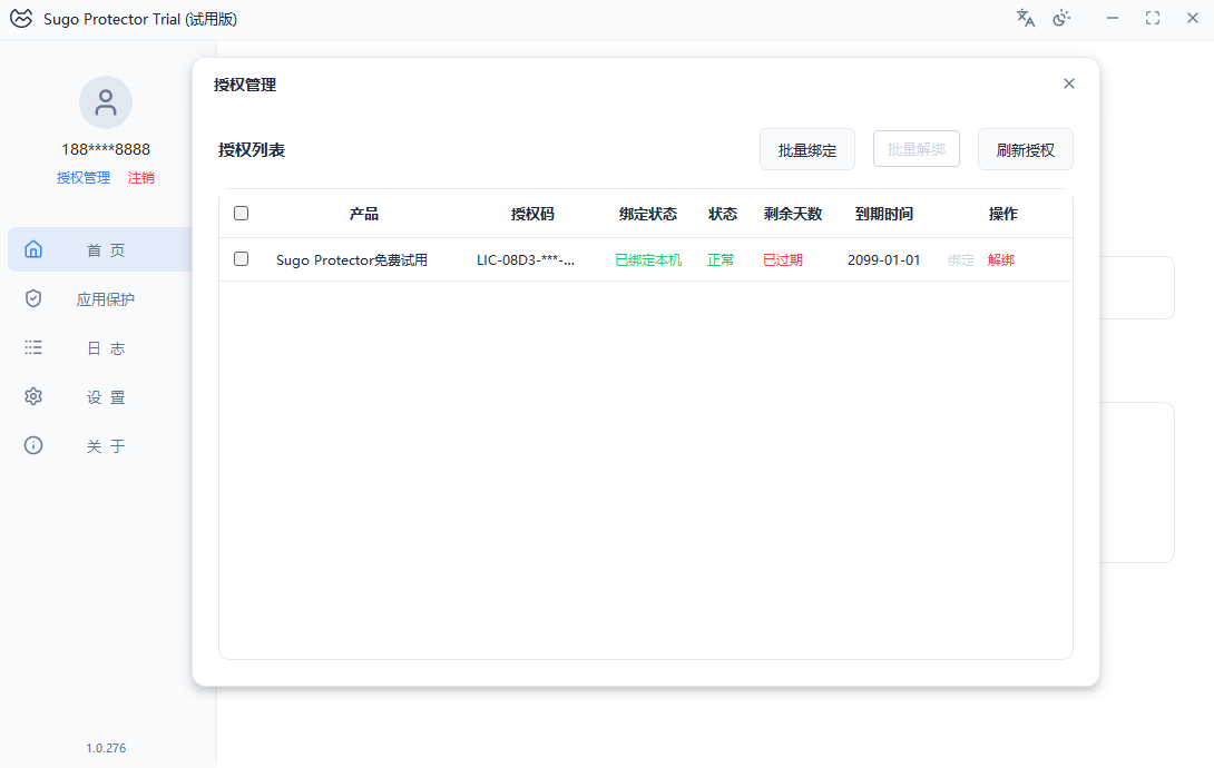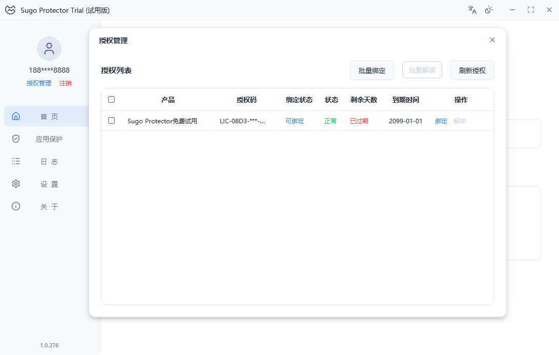 - 查看授权:在授权列表中,您可以看到当前拥有的产品授权(如“Sugo Protector免费试用”)、授权码及剩余天数。