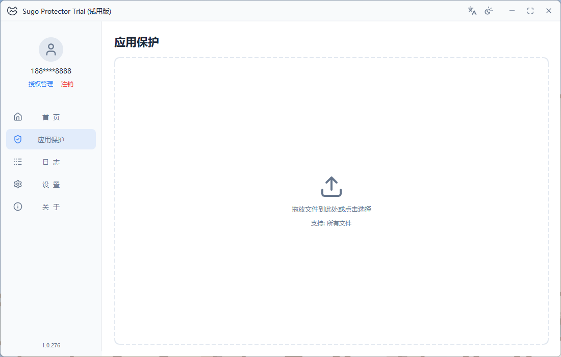 导入文件:直接将需要保护的 EXE 或 DLL 文件拖入中央区域,或者点击屏幕中央的图标选择文件。(参考截图 5)